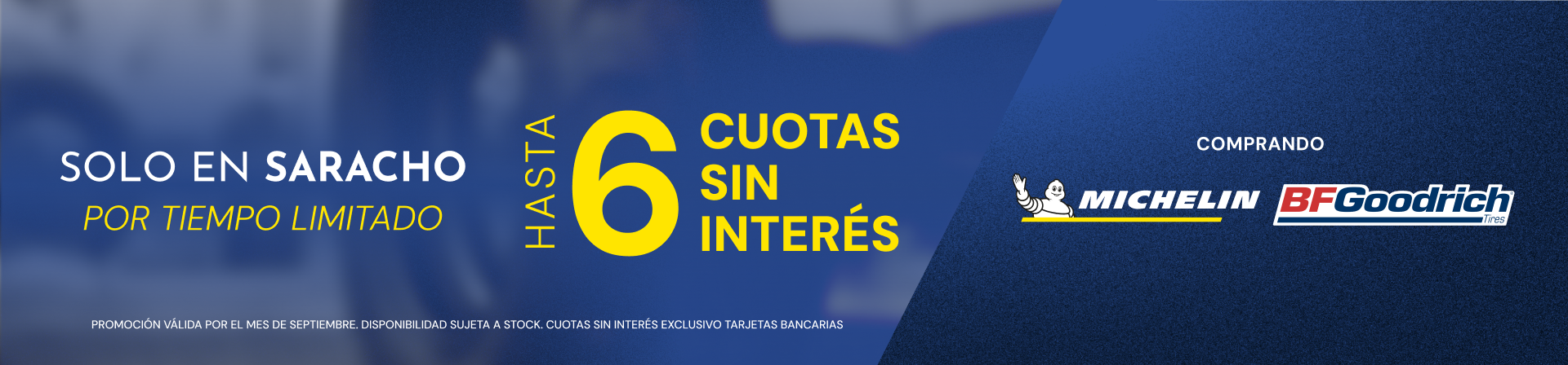 APROVECHÁ LAS MEJORES PROMOS EN SARACHO : HASTA 12 CUOTAS SIN INTERÉS EN NEUMÁTICOS MICHELIN Y BF GOODRICH | ENVIOS A TODO EL PAÍS | DESCUENTOS EXCLUSIVOS EN PRODUCTOS SELECCIONADOS | 30% OFF EN UN PAGO Y 3 CUOTAS SIN INTERÉS EN HERRAMIENTAS Y ACCESORIOS PARA EQUIPAR TU VEHÍCULO | ¡COMPRÁ ONLINE FÁCIL, RÁPIDO Y SEGURO!