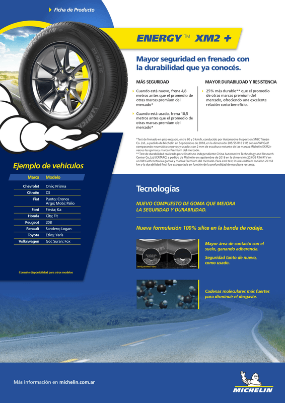 MICHELIN Energy XM2+ es el neumático más seguro de su categoría: en pisos mojados, frena 4m antes que el promedio de los principales competidores, reduciendo el riesgo de accidentes.