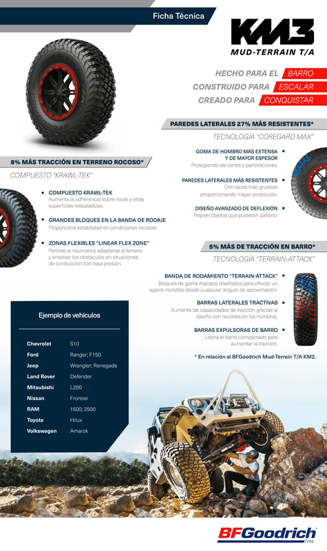 - Ayuda a prevenir cortes y perforaciones del flanco gracias a la tecnología probada en competición derivada del neumático BFGoodrich® Baja T/A® KR3.