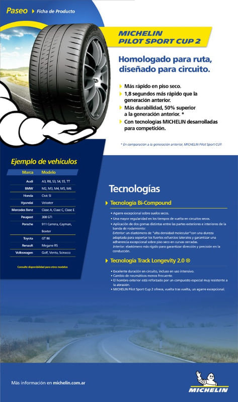 Los Pilot Sport Cup 2 son, en esencia, unos neumáticos semi-slick para circuito, que también pueden usarse en carretera con todas las garantías. Están orientados a gente que acude a track-days, ayudándoles a sacar el máximo partido a su deportivo en circuito y evitando tener que contar con un segundo juego de neumáticos para circular legalmente por carretera.